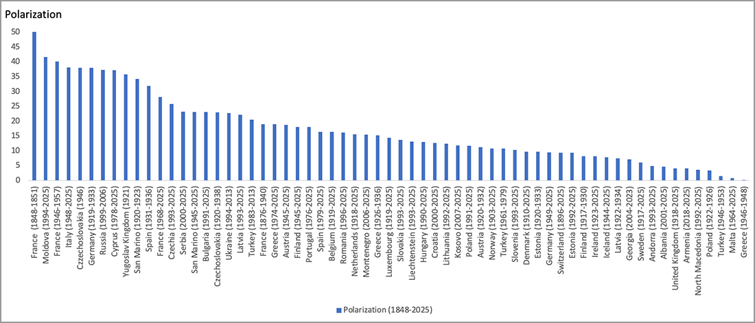 Bearing in mind that “the greater the overall ideological distance between the parties, the more the system is polarized, and vice-versa”, polarization is calculated by taking into consideration the percentage of votes obtained by “anti-political-establishment” parties. The latter are understood as those fulfilling “all of the following criteria: (1) it perceives itself as a challenger to the parties that make up the political establishment; (2) it asserts that a fundamental divide exists between the political establishment and the people (implying that all establishment parties, be they in government or in opposition, are essentially the same; and (3) it challenges the status quo in terms of major policy issues and political system issues” (see Sartori, 1976; Abedi, 2004: 12; Karvonen and Quenter, 2003: 142).